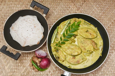Experience the soul of backwater cuisine: three handmade appams paired with a refined salmon stew. A fragrant balance of creamy coconut, tangy tamarind, and tempered spices creates a light yet deeply flavorful seafood pairing.- $ 19.00
